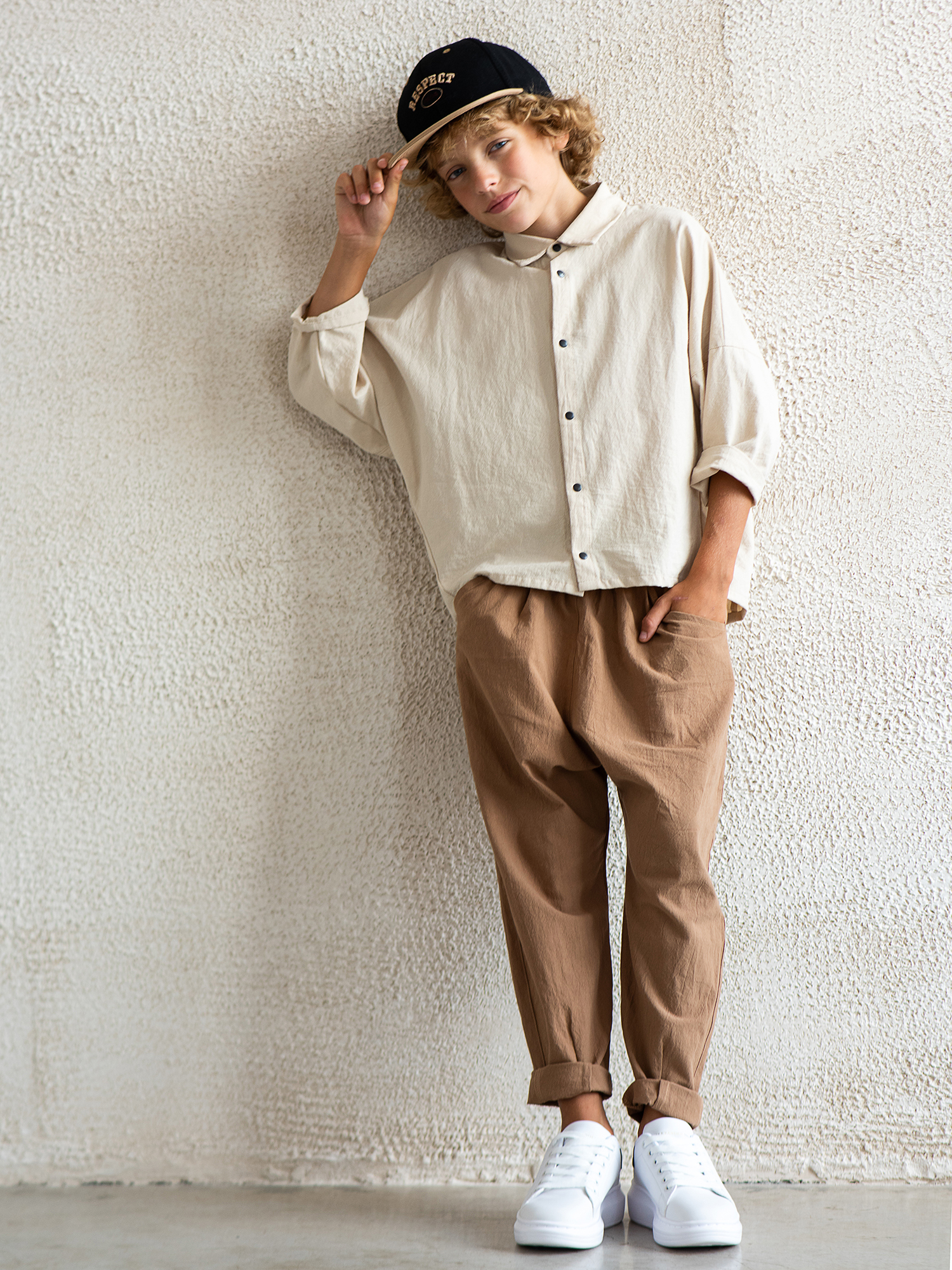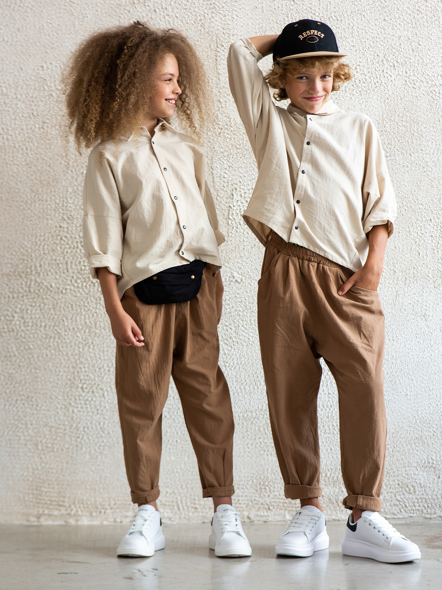 Модель унисекс. Оригинальная форма — широкие сверху, зауженные к низу. По бокам  вместительные кармашки, пояс на резинке для лучшей посадки. Идеальны для тёплой погоды, для поездок на море, для дома, садика и школы.