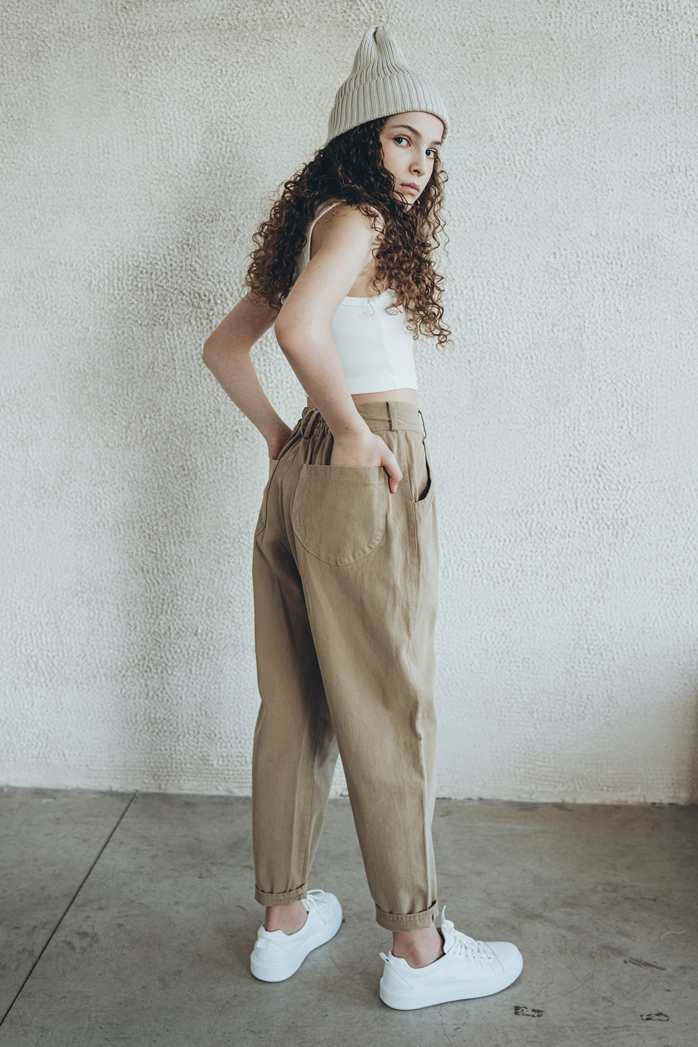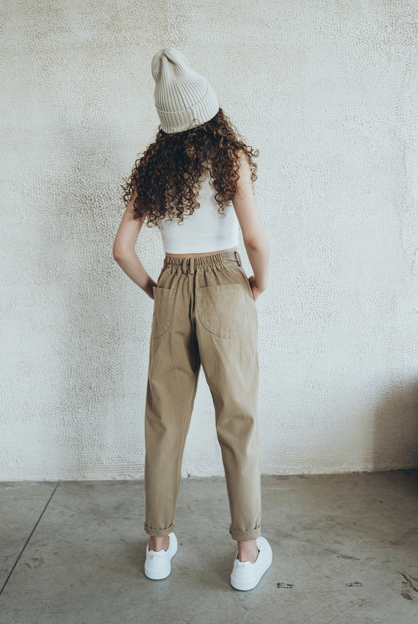 Свободные сверху, зауженные к низу, сзади пояс дополнен резинкой — всё, что нужно для идеальной посадки по фигуре)